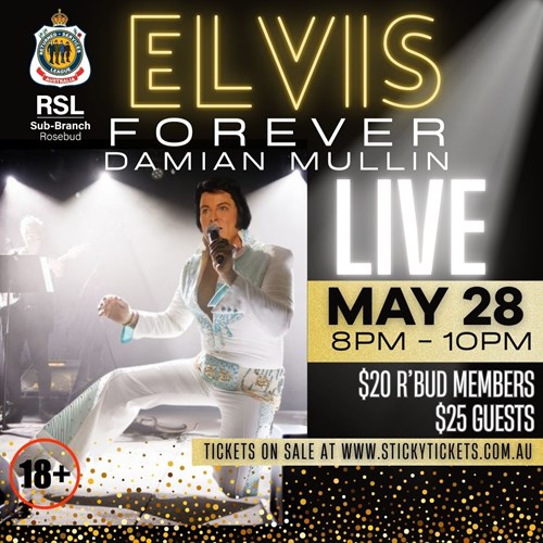 Elvis Forever is a highly acclaimed tribute show featuring award-winning Elvis Tribute Artist, Damian Mullin. Scheduled for May 28, 2026, at the Rosebud RSL, this event showcases Mullin's remarkable transformation into 'The King' with designer costumes and an authentic performance style. The show promises an engaging experience for fans of Elvis Presley, capturing the essence of his music and charisma. Seating is assigned, and it is recommended for groups to book together to ensure they are seated together.