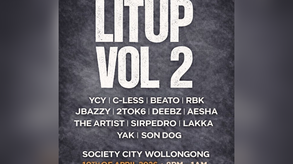 LITUP Presents: VOL 2 is a hip hop music event organized by LITUP, marking their return to Wollongong as the second volume in the series. It features live performances by Australian rap artists including YCY, C-LESS, BEATO, DEEBZ, 2TOK6, JBAZZY, RBK, AESHA THE ARTIST, YAK, LAKKA, SIRPEDRO, and SON DOG. The event emphasizes hip hop music and culture, taking place at Society City venue in Wollongong on April 10, 2026. Tickets are available now, highlighting its appeal to fans of Australian rap. It is designated as an all-ages event with no explicit age restrictions mentioned.